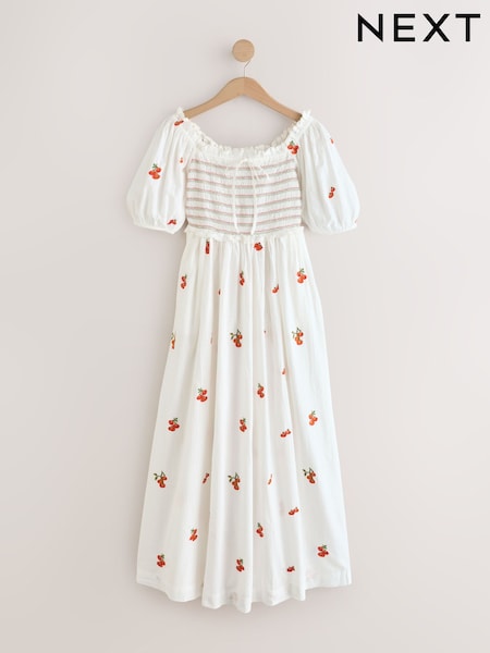 White Tomato Embroidery Puff Sleeve Shirred Midi Dress