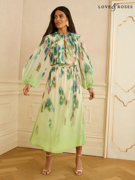 River Island Green Long Sleeve Plisse Midi Dress