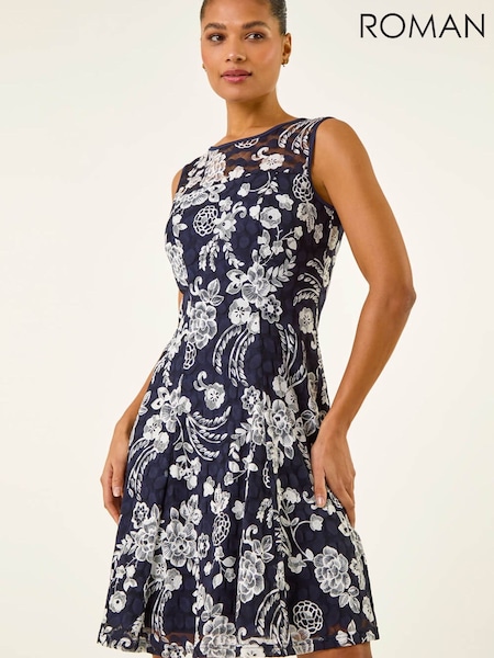 Roman Blue Floral Print Lace Stretch Dress