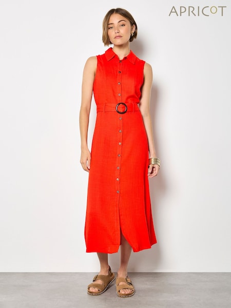 Apricot Red Linen Blend Shirt Midi Dress