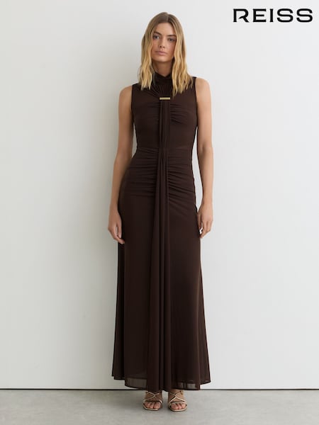 Reiss Chocolate Brown Colette Ruched Sleeveless Maxi Dress