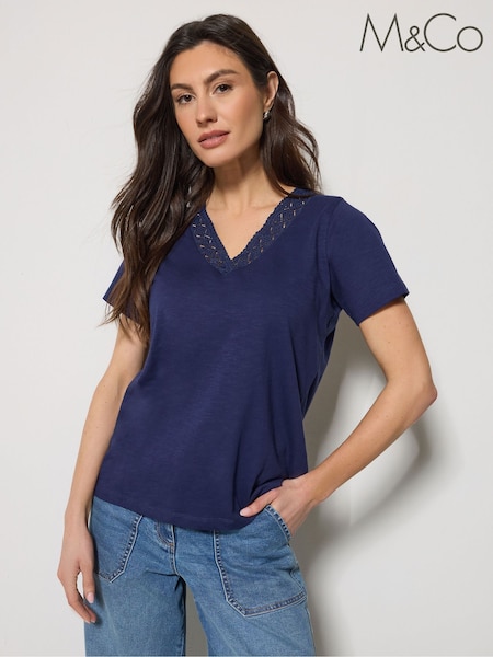 M&Co Blue Lace Trim V-Neck T-Shirt