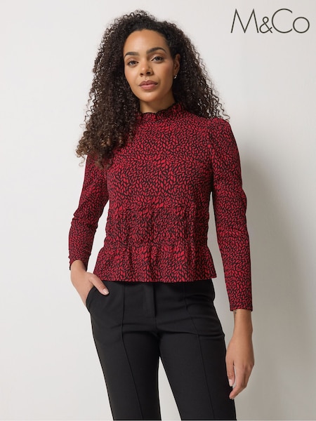 M&Co Red Abstract Print Shirred Top