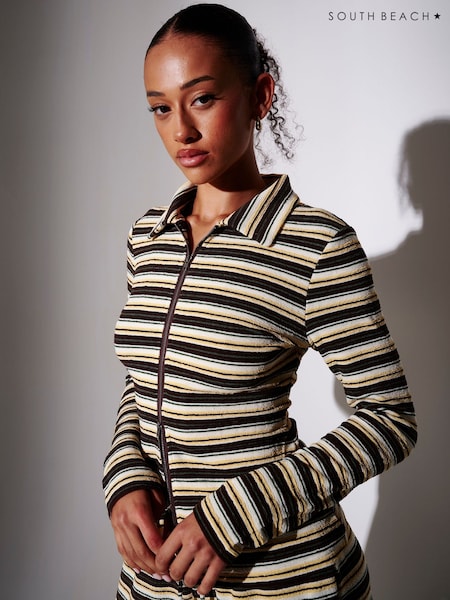 South Beach Yellow Towelling Stripe Collared Long Sleeve Zip Through Top