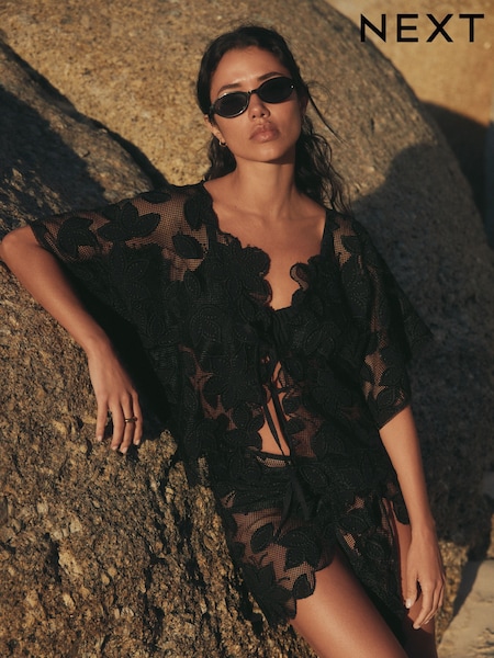 Black Floral Mesh Tie Front Cover-Up