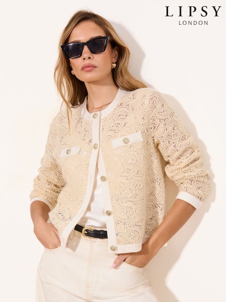 Lipsy Cream Mesh Pattern Detail Long Sleeve Knitted Cardigan