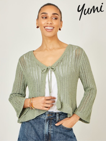 Yumi Green Tie Front Knitted Pointelle Cardigan