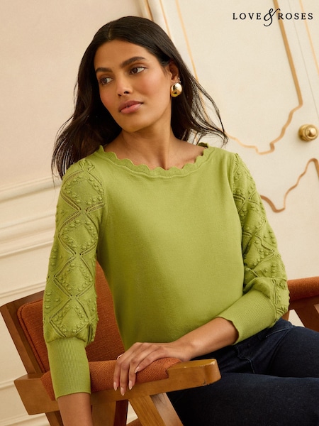 Love & Roses Lime Green Petite Bobble Stitch Scallop 3/4 Sleeve Knit Jumper