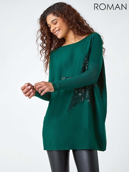 Roman Green Embellished Star Print Longline Jumper