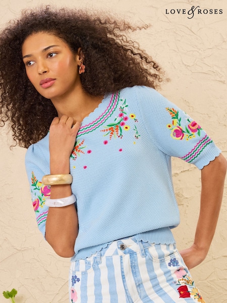 Love & Roses Pale Blue Flower Embroidered Detail Knitted Short Sleeve Top