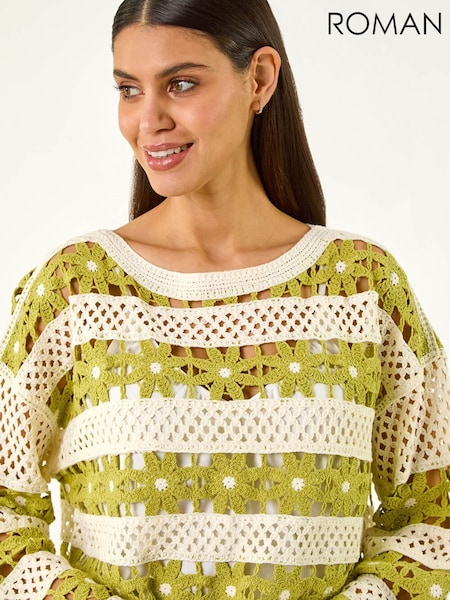 Roman Green Floral Stripe Crochet Knit Jumper