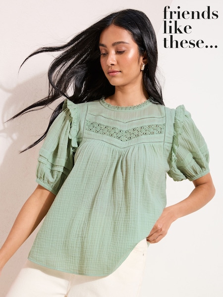 Friends Like These Green Short Sleeve Textured Top With Crochet Detail Blouses