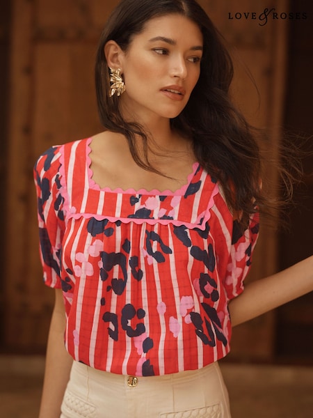 Love & Roses Red Animal Stripe Square Neck Puff Sleeve Blouse
