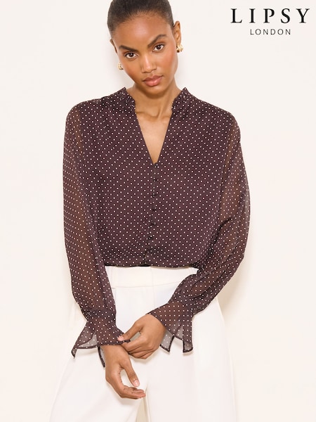 Lipsy Chocolate Brown Spot Frill Collar Detail Chiffon Shirt