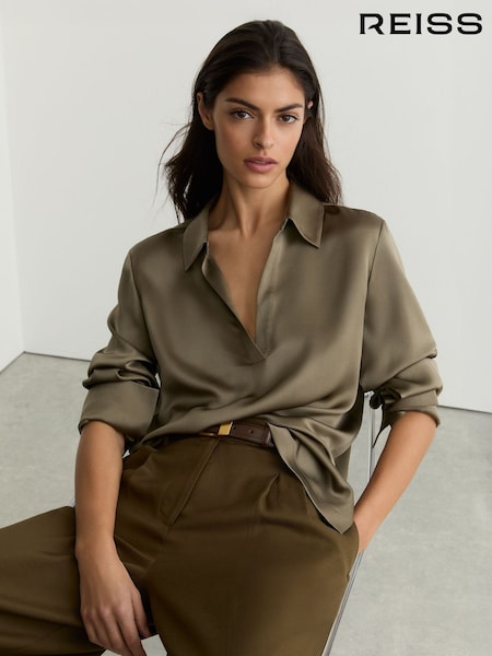 Reiss Khaki Green Marina Silk Open-Collar Blouse