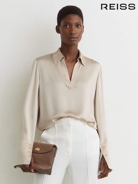 Reiss Neutral Marina Silk Open-Collar Blouse