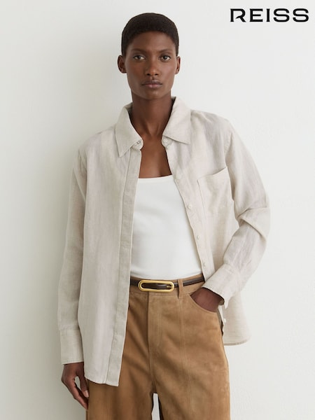 Reiss Beige Neutral Belle Linen Patch-Pocket Long-Sleeve Shirt