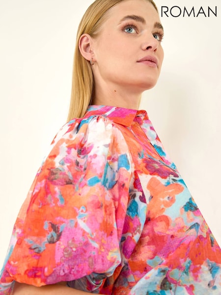 Roman Orange Abstract Print Buttoned Blouse