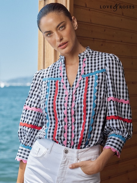 Love & Roses Black Gingham Petite Ric Rac Trim 3/4 Sleeve Notch Neck Blouse