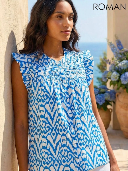 Roman Blue Abstract Print Pleated Sleeve Blouse