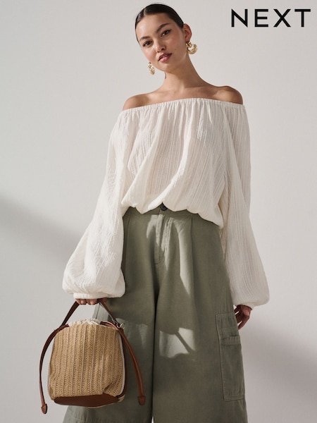 Ecru Textured Long Sleeve Bardot Blouse