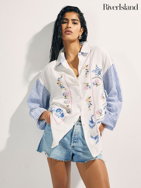 River Island White Embroiderd Stripe Patchwork Shirt