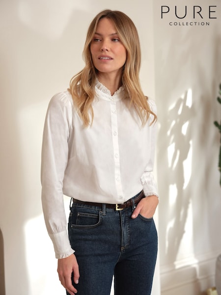 Pure Collection White Cotton Frill Neck Fitted Shirt