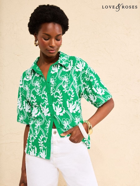 Love & Roses Bright Green 3D Embroidery Button Down Short Sleeve Shirt