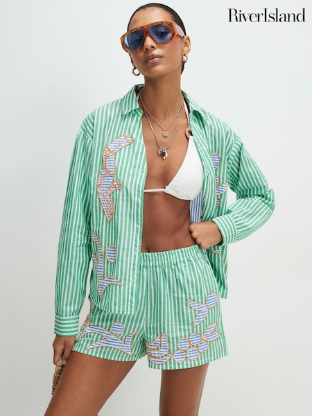 River Island Green Elasticated Striped Embroidered Shorts