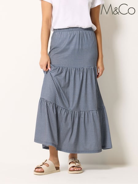 M&Co Blue Petite Gingham Print Tiered Skirt