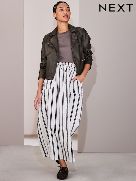 Ecru/Navy Stripe Crinkle Textured Midi Skirt
