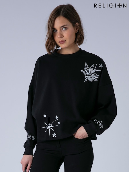Religion Black Love Batwing Sleeve Sweatshirt with Contrast Embroidery Design