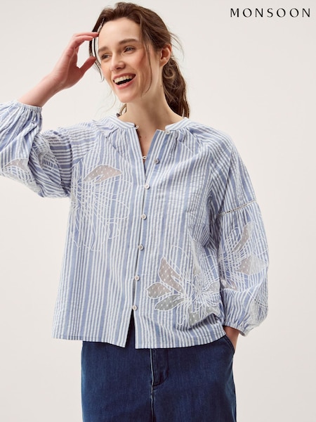 Monsoon Blue Maia Embroidered Stripe Blouse