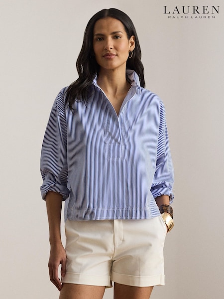 Lauren Ralph Lauren Blue Striped Cotton Broadcloth Tie-Neck Shirt