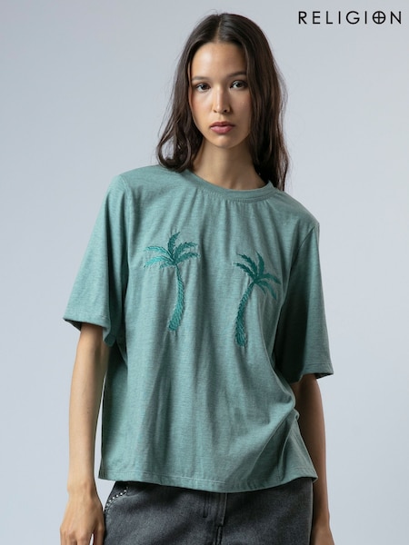 Religion Green Boxy T-Shirt In Overdyed Lime With No Sun No Fun Embroidery