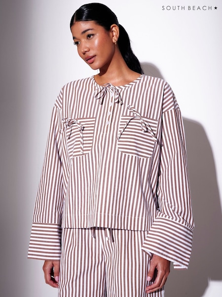 South Beach Brown Stripe Long Sleeve Tie Front Shirt with Pockets