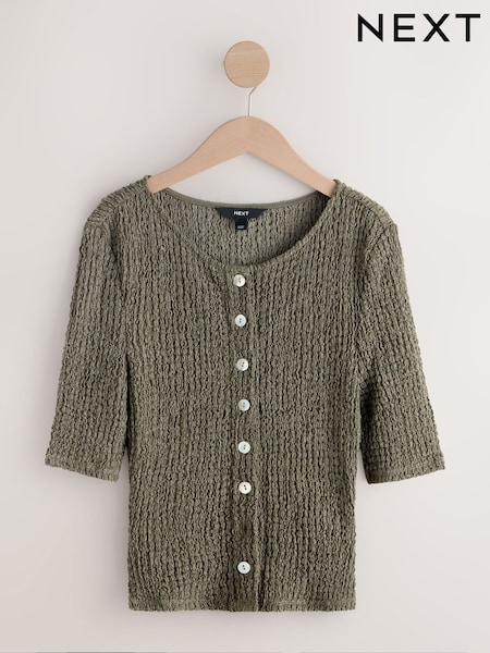 Khaki Green Textured Button Through Half Sleeve Top