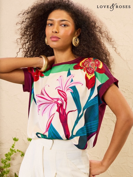 Love & Roses Berry Red Floral Satin Front Jersey Short Sleeve Top