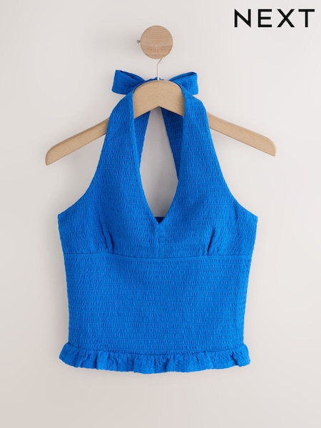 Blue Shirred Halter Neck Sleeveless Top
