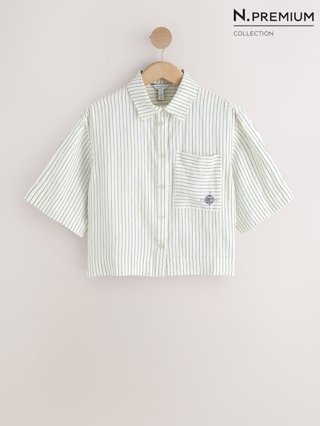 Ecru Compass Print N. Premium Linen Short Sleeve Shirt