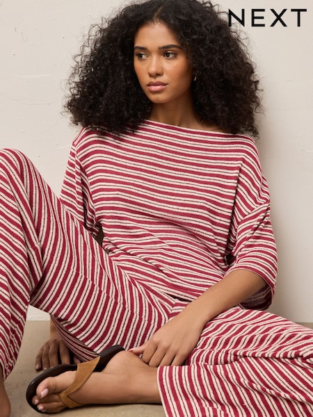Red/Ecru Stripe Knit Look Asymmetric Short Sleeve Top