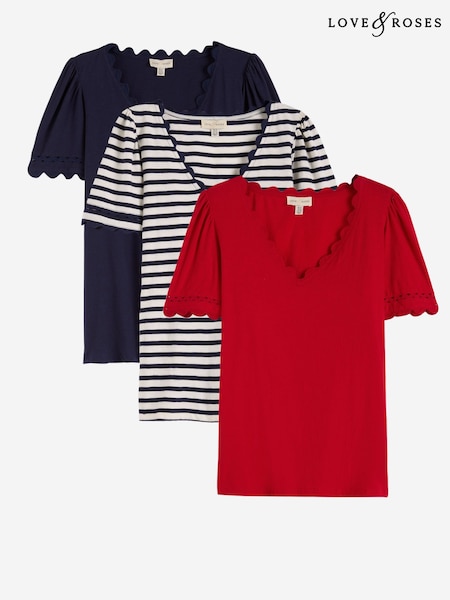 Love & Roses X3 Red Navy and Stripe Scallop V-Neck T-Shirt