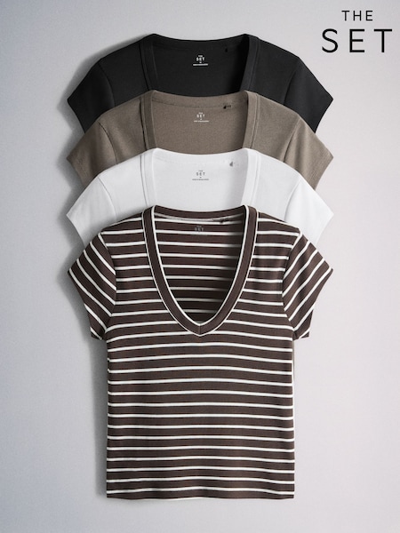 The Set 4 Pack V-Neck Cap Sleeve T-Shirts Black/Brown/Brown Stripe/White