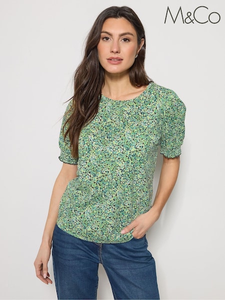 M&Co Green Ditsy Floral Puff Sleeve Top