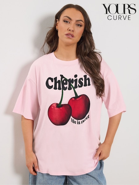 Yours Curve Pink Cherish' Cherry Slogan T-Shirt