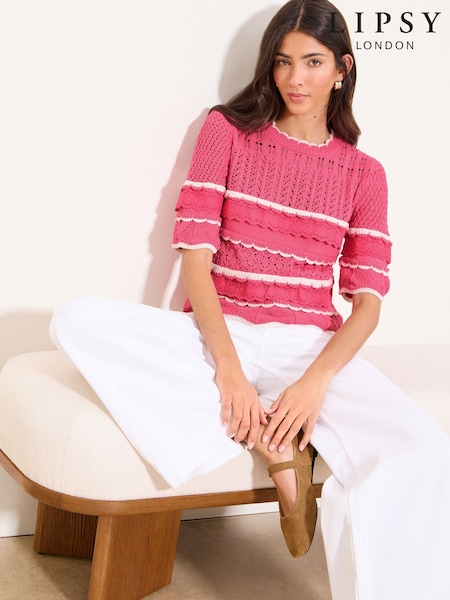 Lipsy Pink/White Broderie Frill Crochet Knit Short Sleeve T-Shirt