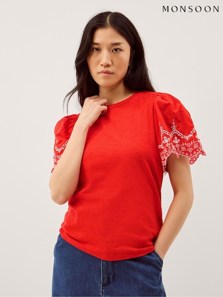 Monsoon Red Bree Broderie Sleeve Jersey T-Shirt