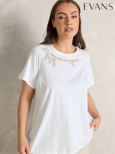 White Embellished Neck Chain Short Sleeve Crew Neck T-Shirt