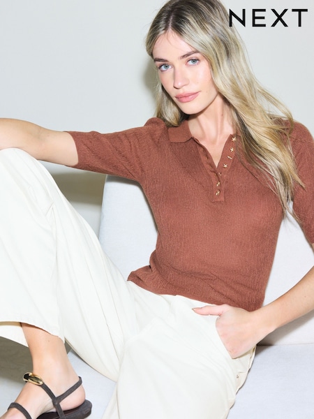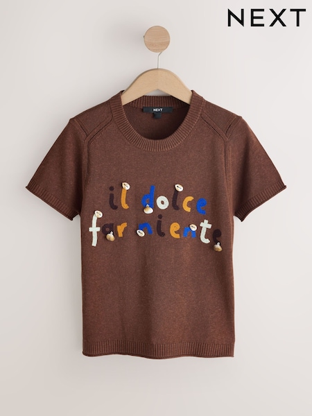 Chocolate Brown Slogan Short Sleeve Crew Neck Top With Linen