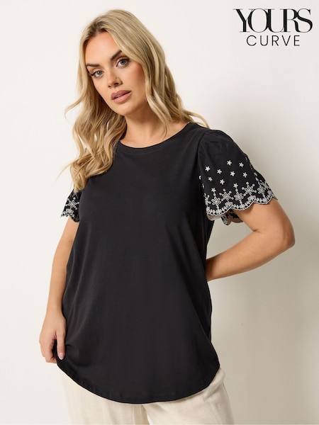 Yours Curve Black Angel Sleeve Embroidered T-Shirt
